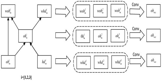 In constructing explicit multiscale semantic information, the short text is first segmented to obtain the corresponding word sequence . Then, the word vector matrix of the short text shown in Figure 1 is obtained by word vectorization through the microtrained word vector model, where n is the number of words and d is the word vector dimension. To fully capture the multiscale semantic information of short texts, the multiscale convolution network is used to convolve W, the convolution kernel sizes are 1, 3 and 5, and the explicit multiscale semantic information matrix is obtained by convolving W.
