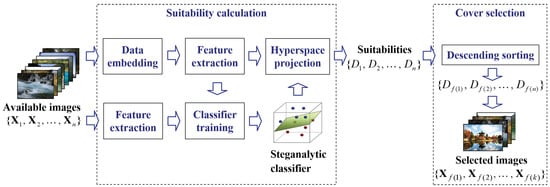 - Kharrazi, M.; Sencar, H.; Memon, N. Cover selection for steganographic embedding. In Proceedings of the 2006 International Conference on Image Processing, Atlanta, GA, USA, 8–11 October 2006; pp. 117–120. [Google Scholar]