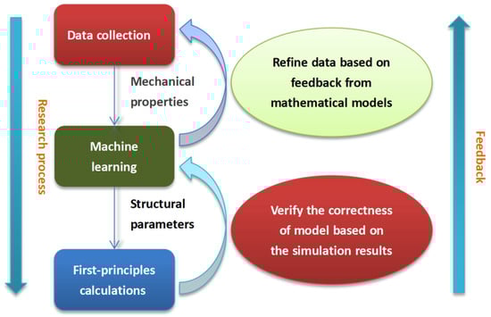 In this work, a composition–property relationship for the biocompatibility of HEAs is built using machine learning combined with first-principles calculations. The flow chart representing this is presented in Figure 1. The different alloying elements are considered in HEAs. The contents of elements affect the mechanical properties, as well as the stability and safety, of the alloy in the organism. The mechanical properties of HEAs are mainly expressed in Young’s modulus and yield strength [,,]. Sufficient strength and appropriate elasticity are critical for biomaterials. After data collection, machine learning and first-principles calculations, an accurate prediction model is established. The optimal proportion of HEA with a good combination of biocompatibility and mechanical performance is obtained.