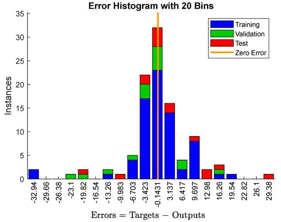 Figure 2 shows the error distribution of the Young’s modulus in the HEAs obtained by machine learning. In addition, the data in the experimental test set are randomly sampled at each machine learning model. The prediction value with an error less than 10% is 86.4%, and the accurate prediction with almost zero error is 31.1%. The prediction error is within 10% for the sample with a Young’s modulus greater than 100 GPa. Overall, however, the results obtained by machine learning are relatively good [,]. Most of the data fall at a fairly accurate zero point. The data used for testing are mostly matched the results of the machine learning. This verifies that the model is valid for predicting the Young’s modulus of the HEA.