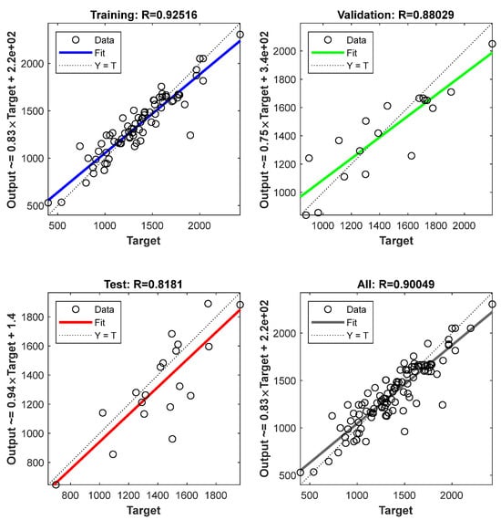 The verification and accuracy of Young’s modulus. The abscissa is the predicted target value, and the ordinate is the actual predicted output value.
