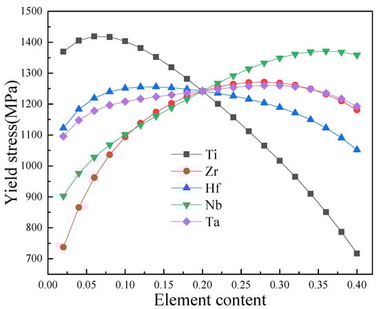 In order to obtain the Ti-Nb-Ta-Hf-Zr HEA with excellent mechanical properties, the content of the single element is changed, and the contents of the other elements maintain a constant proportion. The influence of the element on the Young’s modulus and the yield strength of the Ti-Nb-Ta-Hf-Zr HEA are obtained using the trained machine learning model, as shown in Figure 6 and Figure 7. Then, the reasonable composition range would be determined from the trained machine learning model. Figure 6 shows the effect of element concentration on the Young’s modulus. Generally speaking, the contents of the Nb and Ta elements are high, and the elastic modulus of the corresponding alloy is high. The high content of the Zr element leads to the decrease of the elastic modulus. When the element content is less than 20%, the Ti and Hf elements have a smaller influence on the elastic modulus, and the Zr, Nb and Ta elements have a larger influence. When the element content is higher than 20% and lower than 40%, the contents of the Ti, Hf and Zr elements are higher, and the elastic modulus of the corresponding alloy is lower.