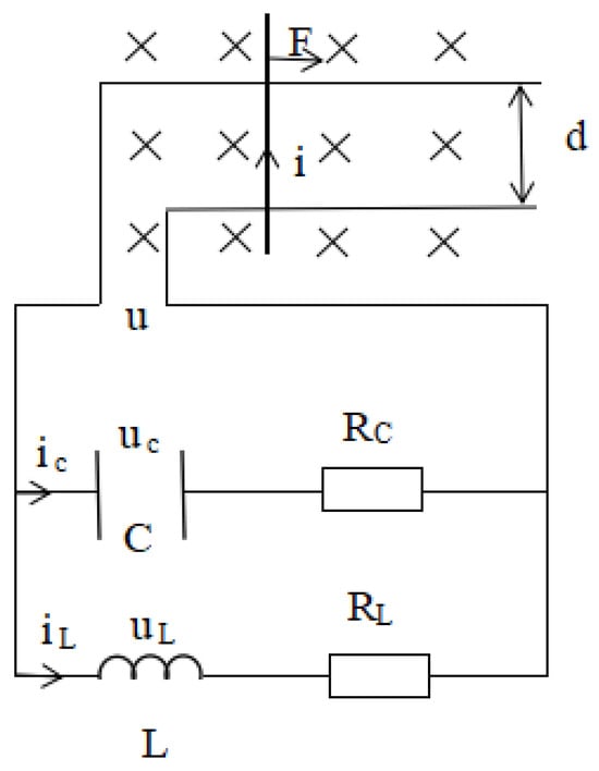 where m represents the mass, d represents the distance between two parallel guides, B represents the magnetic induction intensity, F represents the external force, C denotes the capacitor, L denotes the inductor, and are the resistance of C and L, respectively, and u and are the voltage, denotes the current through L.