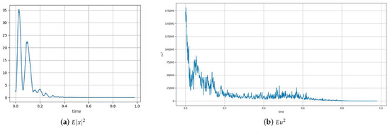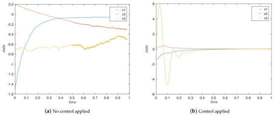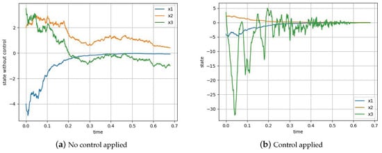 For simulation, we select randomly set the initial conditions as , and the parameters Figure 2a shows the state of system (44) without control u applied. Figure 2b shows the response of system (44) and (50). Figure 3 illustrates the effectiveness of controller u. According to Figure 4, we find that , which means that the prescribed-time mean-square stabilization is achieved. Therefore, the effectiveness of the controller design developed in Section 3 is demonstrated.