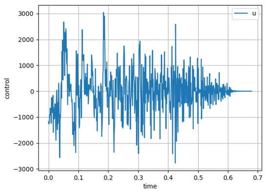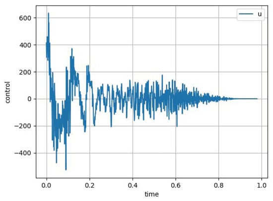 The derivation of this example will not be repeated. For simulation, we select , , and randomly set the initial conditions as , . Figure 5a shows the state of system (51) without control u applied. Figure 5b shows the response of system (51) with controller u for Example 2. Figure 6 illustrates the effectiveness of controller u. Therefore, the validity of the controller design developed in Section 3 is demonstrated.