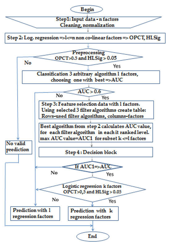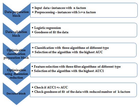 In this case study, logistic regression is selected from the conventional statistic group of methods and used as a basic method. The basic measures of goodness of fit of the proposed model with the considered data are generated using the Hosmer and Lemeshow test. In the case that this test returns unsatisfactory results, the relevant literature [59,60,61] suggests using the classification test that exists in supervised ML-based classification as a so-called function method. This method can be implemented in classification discrimination using classification and feature selection algorithms and, after that, evaluated with the most important classification measures, such as area under the curve (AUC) and accuracy.