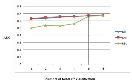 Also, the receiver operating characteristic (ROC) curve, which has been commonly used to evaluate the performance of classifiers in predicting outcomes, is used in this study. In the ROC diagram, the false positive rate is presented on the x-axis, and the true positive rate is given on the y-axis. It should be noted that certain points on the ROC curve have specific meanings [63,64]; for instance, a point (0, 1) represents a perfect prediction, a point (1, 1) indicates that a classifier labels everything as positive, and a point (1, 0) shows that a classifier labels everything incorrectly. The area under the ROC curve (AUC) is a measure of the diagnostic accuracy of a classifier model, and generally, the AUC values greater than 70% indicate a good classification performance.