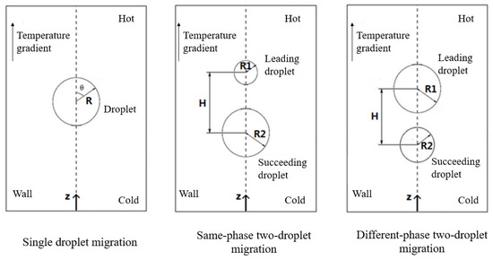 For the problem of the thermocapillary migration of droplets, research work mostly focuses on numerical simulation. Brady [4] analyzed the thermocapillary migration process of three-dimensional deformable droplets and found that the shape of the cell wall ultimately affects the droplet migration process. Loewenberg [5] calculated the thermocapillary migration velocities of two axisymmetric droplets with different radius ratios. Berejnov [6] gave the evolution of the center distance between two drops over time and discussed the thermocapillary migration process and the interaction of two drops with different radius ratios. Yin [7,8] investigated the thermocapillary migration process of a single droplet with no deformation and discussed the influences of dimensionless parameters and initial conditions on the migration, and also investigated the thermocapillary migration of a two-droplet pair with different radius ratios and the interaction between the two droplets, and analyzed the migration velocities of the large succeeding droplet and the small leading droplet.
