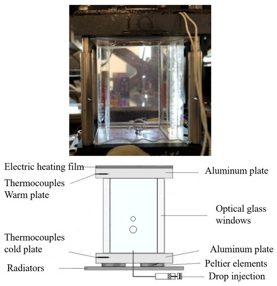 Based on the principles of the single-droplet migration model, the same-phase two-droplet migration model and the different-phase two-droplet migration model are shown in Figure 1. We constructed an experimental model that can be used to carry out a variety of droplet migration studies, as shown in Figure 2. The inner cavity of the liquid pool is 40 mm × 40 mm × 70 mm. The liquid pool has four walls of K9 optical glass, and top and bottom plates made of aluminum, with a number of injection holes on the bottom plate; the top plate is heated by an electric heating film, and the bottom plate is cooled by a semiconductor refrigeration plate; the program is written in Labview to ensure a constant temperature gradient in the mother liquor. The density-matching method is used to reduce the buoyancy effect caused by gravity to study the droplet thermocapillary migration. The 30 cSt silicone oil is selected as the mother liquor, and the glycerol–ethanol and water–ethanol mixtures are used as the droplet liquid to realize the single-droplet migration, the same-phase two-droplet migration, the different-phase two-droplet migration, and so on. The ratio of the droplet diameter to the width of the mother liquor is defined as Ar = d/W, where d is the droplet diameter and W is the width of the mother liquor (the width of the liquid pool). Physical parameters are shown in Table 1.