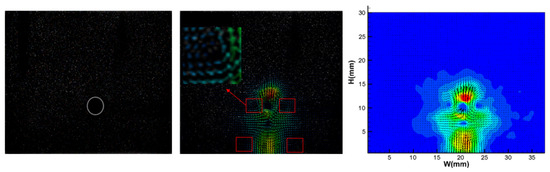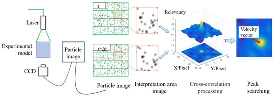Particle image velocimetry, referred to as PIV, has been a mature technique and advanced products are available since its inception in the 1980s. But due to the need for simultaneous measurements of the velocity field and the temperature field in this study, we built our own optical system based on the basic principles of PIV. The basic principle of PIV is that the flow field filled with tracer particles is illuminated by the slice of light formed by the laser through a column lens, and the image is continuously captured twice or multiple times by a CCD camera to obtain the PIV film, as shown in Figure 3. The product correlation algorithm (Equation (1)) is usually used in the image processing, combined with the normalization method (Equation (2)); the image recognition can be achieved to obtain the magnitude and direction of the velocity of the flow field.