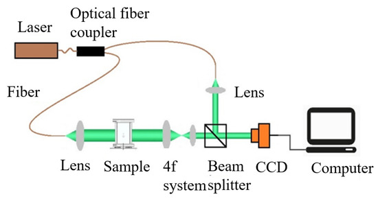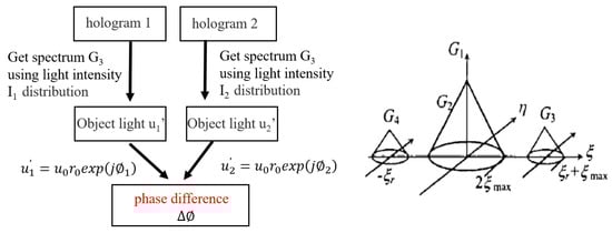 The optical path of the digital holographic interferometry (DHI) system is shown in Figure 4, and the numerical reconstruction is shown in Figure 5. The laser beam generated by the laser is transmitted through an optical fiber, which reduces the influence of external noise on the light source. The laser source is divided into a beam of object light and a beam of reference light by the fiber coupler. The object beam is transmitted through the experimental fluid after beam expansion and collimation. Due to the temperature gradient in the experimental mother liquor, the refractive index distribution in the mother liquor is heterogeneous, which results in the corresponding modulation of the phase distribution of the wavefront of the object light, and this modulation changes with the refractive index distribution of the fluid. The transmitted object beam passes through the 4f system and then is projected onto the photosensitive surface of the CCD camera through a beam-splitting prism. The reference beam, after beam expansion and collimation, is projected onto the photosensitive surface of the CCD camera through a beam-splitting prism. As it interferes with the modulated object beam, the hologram is formed. The CCD records the holograms of the mother liquor in different states and obtains the phase changes of the object beam in different states through numerical reconstruction, thereby obtaining the changes of refractive index. The complex amplitude of the light received by the CCD target can be obtained through Equation (3); the intensity of the light received by the CCD target can be obtained through Equation (4). The spatial spectrum of the hologram can be obtained by Fourier transform of the light intensity distribution. Among G1, G2, G3 and G4, G3 and G4 are the ±1 level spectra of the object light, respectively. After extracting G3 or G4, the inverse Fourier transform can be used to obtain the object light on the hologram plane. The temperature distribution in the mother liquor in the corresponding state is then deduced from the relationship between refractive index and temperature.