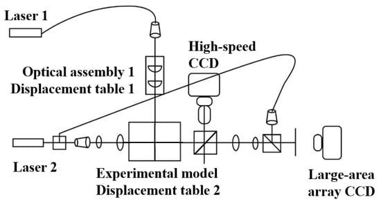 Based on the basic principles of particle image velocimetry (PIV) and digital holographic interferometry (DHI), a platform for simultaneous measurements of velocity and temperature fields is constructed, and the schematic diagram and the physical layout are shown in Figure 6 and Figure 7 respectively. The digital holographic interference system (DHI) uses laser 2 with a wavelength of 532 nm and a power of 50 mW to output a laser beam which is transmitted to an optical platform through an optical fiber. The laser beam passes through a lens set to form a parallel beam with a beam aperture greater than 50 mm. After this parallel beam passes through the experimental section and the lens group, an object beam with a beam aperture of less than 15 mm that matches the size of the CCD target is formed through the beam-splitting prism. The object beam meets the reference beam and forms an interferogram that is recorded by the large-area array CCD. The phase map is reconstructed from the hologram and the physical field distribution is obtained. The particle image velocimetry (PIV) system uses laser 1 with a wavelength of 561 nm and a power of 150 mW to output a laser beam which is transmitted to an optical platform through an optical fiber. The laser beam passes through a column lens to form a slice of laser light, illuminating a cross section of the experimental section; a sequence of particle images characterizing the fluid structure are recorded by a high-speed CCD camera with a filter installed in front of the camera, and the filter has the same output wavelength as laser 1; then the information such as the velocity distribution of the flow is obtained through the correlation processing of the particle images.