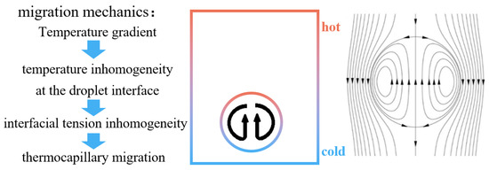 The droplet migration problem is a complex process driven by the coupling of multiple physical fields. The droplet is submerged in another immiscible mother liquor, and a temperature gradient is added to the mother liquor, which causes the temperature inhomogeneity at the droplet interface and leads to the inhomogeneity of the interfacial tension, thus driving the flow of the fluids on both sides of the interface, and the droplet will move due to the reaction force of the shear stress of the mother liquor, which is called the thermocapillary migration of the droplet. Previous studies have concluded that in the process of droplet thermocapillary migration, convective cell elements are formed inside the droplet, and the around-flow is formed outside the droplet, as shown in Figure 8. We have obtained results that are different from this conclusion by simultaneous measurements of the velocity field and the temperature field during the droplet migration process, and have gained a brand new understanding of the process of droplet migration.