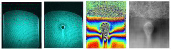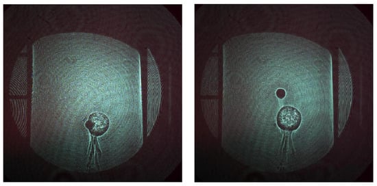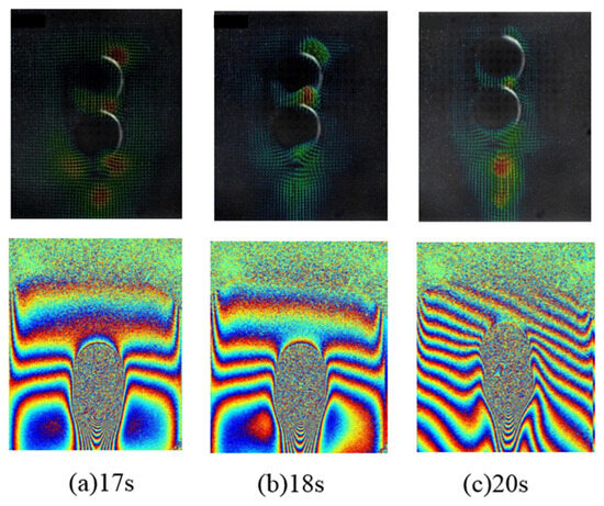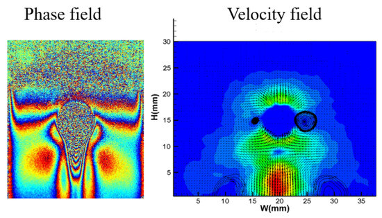 The hologram at t = 0 and the hologram at a certain moment in the droplet migration process are collected, and the original holograms are processed to obtain the phase distribution map that reflects the temperature field distribution and the temperature field distribution (unwrapped phase map) at the corresponding moments, as shown in Figure 9. Throughout the whole process of droplet migration, from the digital holographic interferometric measurements, it is found that there exists a thermal boundary layer near the interface of the droplet, and the droplet tail appears as a thermal wake.