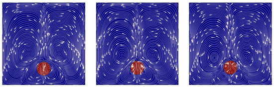 Numerical simulations of the single-droplet thermocapillary migration flow field are performed using a dynamic mesh method and no-slip boundary condition. Dynamic mesh method is a multiphysics interface designed to model laminar two–phase flow of immiscible fluids separated by a moving interface. The focus is on the droplet migration process. The temperature gradient of the mother liquor causes the interfacial temperature gradient between the mother liquor and the droplet, which leads to the interfacial tension gradient, driving the flows of the intradroplet fluid and the mother liquor, thus causing droplet migration, as shown in Figure 14. Boundary conditions exist in the mother liquor, which have a large impact on the flow of the mother liquor and the behavior of the droplet. During the upward migration of the droplet, the velocity of the mother liquor is zero at the boundary, and the velocity of the mother liquor around the droplet is the same as the droplet velocity. Due to the mass conservation of the mother liquor, the moving direction of the mother liquor farther away from the droplet is opposite to the moving direction of the droplet during the migration process, which gradually forms the tail vortex behind the droplet. Numerical simulation results show that four vortex cells are formed in the mother liquor, and the vortex cells in the droplet gradually develop from two to four. This conclusion is the same as our experimental results.