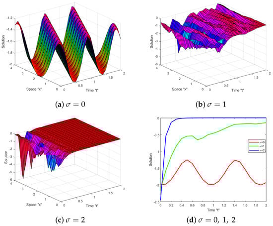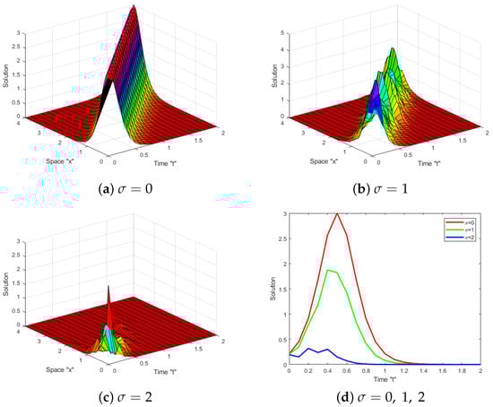 (a−c) present 3D shapes of the solution given in Equation (59) for and for various (d) shows a 2D profile for these values of .