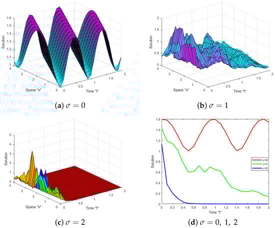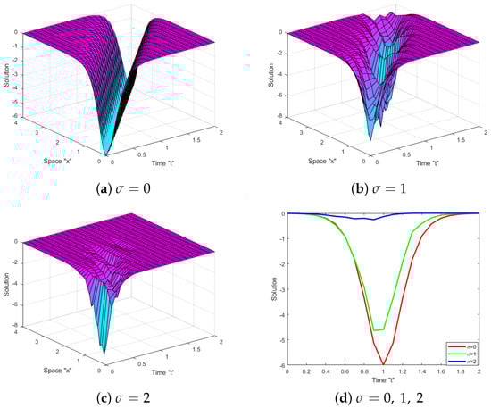 (a−c) present 3D shapes of the solution given in Equation (58) for and different (d) shows a 2D profile for these values of .