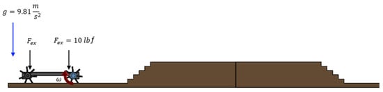 By using Table 1, 63 simulations were performed, in which the scenarios were varied to see the behavior of the robot when trying to climb the stairs. These 63 simulations are the combinations of varying the wheels from 3 to 10 legs, with eight different radii of wheels to climb two types of stairs with different dimensions. Figure 3 is an example of the simulations performed, applying gravity to the robot structure. The angular velocity of the robot motors was varied from = 15 rpm and ended the simulation with = 10 rpm. These angular velocities, according to different authors, show some variations, with [] using 6.667 rpm, whereas [,] used 15 rpm, and [] used 16.5 rpm. Two external forces, (20 lbf) are applied to the ends of the structure due to the design of it, which is hollow in the center. Variations in the weight that such a structure can carry range from 1.6 lbf to 20 lbf [].