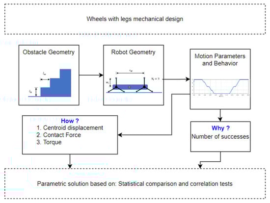 In order to verify if this ratio has normal behavior, a Shapiro–Wilk test was performed on all the calculated coefficients grouped by their . Subsequently, the results of how the robot manages to perform the test, the torque of the motors, and the contact force were analyzed. For this, the successful coefficients were categorized to find the ranges in which the probability of success of the robot is higher. The complete method of this research can be seen in Figure 4. At the end of the statistical analysis, an additional simulation is carried out to calculate the dimensions of the wheel legs based on (2) for a stair with dimensions different from those already carried out.