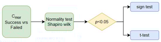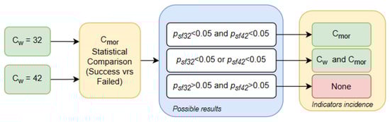 For the , the total number of tests was divided according to its and according to the success or failure in performing the test. Subsequently, a normality test was applied according to its to determine the type of statistical comparison test to be performed. If the statistical comparison test obtained a value , it means that there was a significant difference between the value, , of the successes and failures. Figure 6 allowed us to determine the incidence of the indicators in the design of these structures.