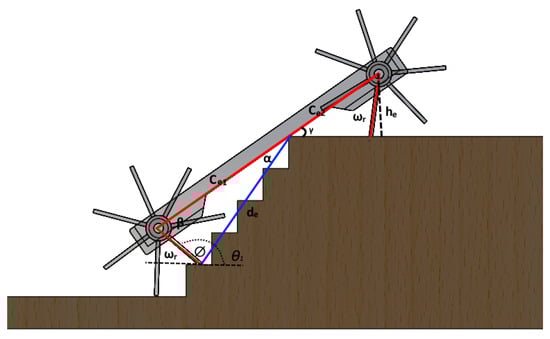 In recent years, some researchers have proposed designs of hybrid locomotion systems based on wheels and legs []. In this work, the height of the stairs is related to the height of the robot, classified as low, medium, and high. These proposals can be classified as robots with wheels and legs, transformable wheels/legs, wheeled legs, and legged wheels.