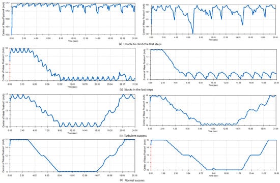 The second question of this research tries to help describe graphically and statistically how the robots climb. On many occasions, the robot can solve the problem of climbing the stairs, but it generates contact forces that can damage the structure, very high torques that can overload the motors, or constant vibrations that can reduce the life of the equipment. Therefore, the simulations will be graphically classified based on the behavior of the center of gravity of the structure. This will be classified into four groups: the first and second groups are the structures that did not manage to climb, the third group represents the structures that climb but without stabilizing their center of mass (turbulent), and the fourth group represents the structures that climb by stabilizing their center of mass (normal). Statistical tests were then performed to compare whether the indicators shown in Figure 7 had different behavior. Finally, a correlation test was performed to determine how much affects the design.