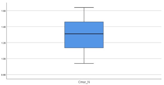 Box-and-whisker plot of the indicator. Mean: 1.32; standard deviation: 0.21; variance: 0.045; lower limit: 1.11; upper limit: 1.53.
