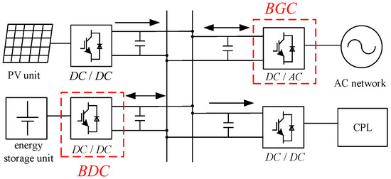 The topology of the DC microgrid studied in this paper is shown in Figure 1, including the PV unit, energy storage unit, AC main network, DC constant power load, and corresponding power electronic converter. BGC is responsible for balancing the power in the grid when the DC microgrid is in the grid-connected mode. The energy storage unit is connected to the DC bus through a bidirectional DC–DC converter (BDC) to realize bidirectional energy flow with the DC microgrid. The PV is connected to the DC bus through a boost converter, using maximum power point tracking control. The DC constant power load is connected to the DC bus through a buck converter, using maximum power point tracking control.