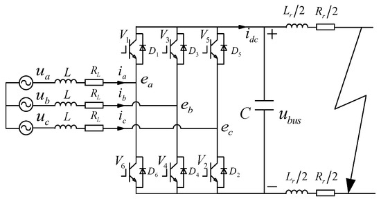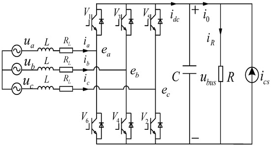 The focus of this paper is to analyze the operation control strategy of BGC in the grid-connected mode of the DC microgrid, so the DC microgrid is simplified into an equivalent topology containing BGC, as shown in Figure 2. In the equivalent topology, the PV unit, the energy storage unit, and their corresponding power electronic converters can be equivalent to current sources [18]. In Figure 2, are the six IGBTs, is the phase voltage of the three-phase AC supply, is the AC side voltage of the grid-connected converter, is the three-phase line current, is the DC bus voltage, is the DC side current, is the DC side output current, is the current flowing through the load, is the inductance of the filter reactor, is the resistance of the filter reactor, is the DC side capacitor, and is the constant power load.