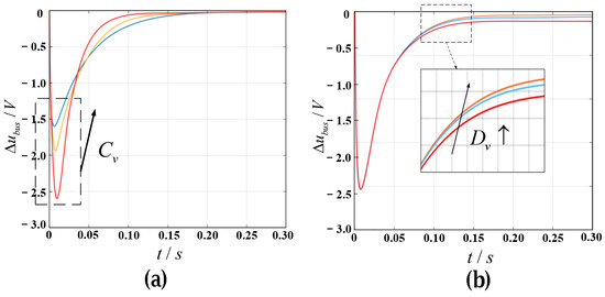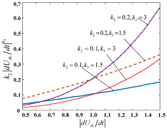 In the selection of parameter , is the adjustment coefficient when the capacitance value changes linearly. In this case, the voltage change rate is not large, and the virtual inertia is expected to be small, so the smaller can be selected. In the selection of parameters and , when the system is subjected to large disturbance, the voltage change rate is large, and the virtual inertia is expected to be large. Therefore, the virtual capacitance value should be increased by increasing the value of on the premise of ensuring the stability of the system. Otherwise, the value of can be appropriately reduced. After selecting the appropriate value of , are selected according to the stability requirements of the system. Figure 4 shows the influence of the change of and on the value of virtual capacitance. As can be seen from Figure 5, an increase of increases the value of during the transient process. For , when the DC voltage change rate , the value of in the transient process will gradually decrease with the increase of . When , the value of gradually increases with the increase of . With the increase of exponential coefficient , the change rate and range of along with also increase, indicating that mainly affects the change rate of .