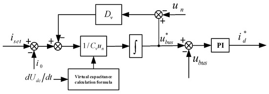 where: is the given value of BGC output current; is the voltage damping coefficient, which characterizes the ability of BGC to dampen the oscillations in the DC bus voltage; is the DC side voltage rating value; is the DC voltage reference value of the virtual inertial outer loop output; is the virtual capacitance value.