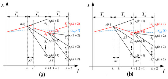 Control delay is a major issue faced by predictive control methods. In practical applications, predictive control algorithms require extensive computations, which inevitably introduce time delays between inputs and optimization drives. The control delay can result in errors in the prediction of the next time step. When considering the delay issue without compensation, the operational flowchart of the FCS-MPC algorithm is depicted in Figure 8a. At time , the system samples and performs calculations to predict the output value at time . Based on the value function, a switching sequence is selected, and the system outputs switch signals to drive the inverter at time . Similarly, at time , the system samples and performs calculations to predict the output value at time . The switching sequence is selected based on the value function, and the system outputs switch signals to drive the inverter at time . After the above analysis, the FCS-MPC algorithm continues to employ the switch sequence implemented in the previous control cycle before the output switch sequence. For instance, during the period from to , the switch sequence used is the optimal switch sequence employed during the period from to , and so forth. Consequently, this leads to deviations of the inverter’s output voltage from the reference voltage, resulting in a deterioration of the quality of the inverter’s output power.
