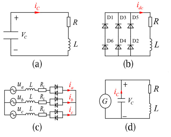 The equivalent circuit diagrams for each stage. (a) shows equivalent circuit of capacitor discharge stage; (b) shows DC side equivalent circuit of uncontrolled rectifier in initial stage; (c) shows AC side equivalent circuit of uncontrolled rectifier in initial stage; (d) shows equivalent circuit of uncontrolled rectifier in steady state stage.