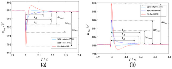 (1) The traditional droop control is a non-inertial control method, which cannot provide inertial support for the DC microgrid. In order to solve this problem, an adaptive AVSG control is introduced into the voltage outer loop of the control strategy. The inertia parameter can be adjusted according to the voltage change rate, which improves the stability of DC bus voltage and the operation ability of the system under asymmetric conditions.