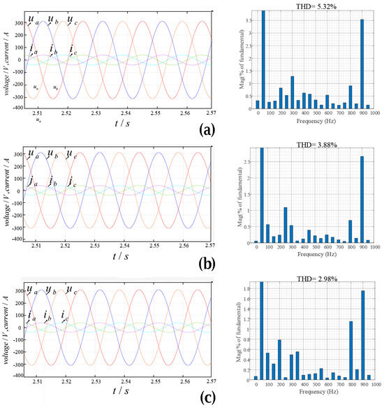 Grid side voltage and current waveform and THD analysis. (a) shows the network side waveform and THD analysis under PI+AVSG control strategy; (b) shows the network side waveform and THD analysis under MPC + AVSG control strategy; (c) shows the network side waveform and THD analysis under MPC + adaptive AVSG control strategy.