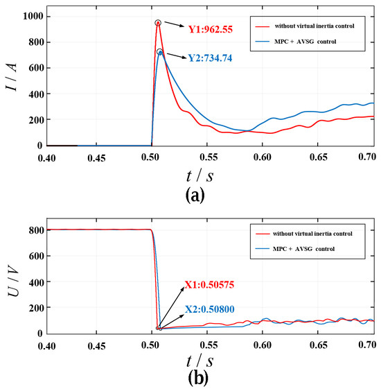 From Figure 19b, it can be observed that when the BGC system does not employ AVSG control, the fault current rapidly increases after a fault occurrence due to the quick discharge of the DC-side capacitor. The peak fault current reaches 962.55 A. However, when AVSG control is applied, the rate of fault current increase slows down, and the peak current is reduced to 734.74 A. Compared to the scenario without AVSG control, the peak fault current is reduced by 227.81 A. This helps to avoid excessive short-circuit current impacts and prevents device burnout.