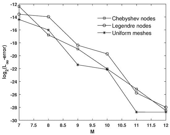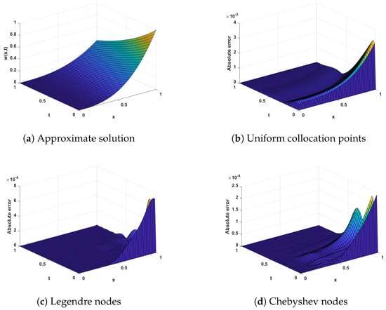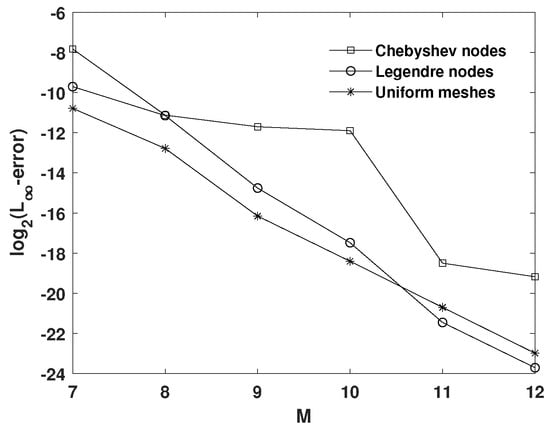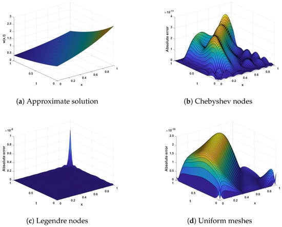 We can determine the unknown coefficients after solving this system using the Newton method. The collocation points in our study are uniformly spaced meshes or the roots of shifted Chebyshev and Legendre polynomials []. As mentioned above, to solve the aforementioned nonlinear system, we use the Newton method. It is worth noting that Newton’s method is implemented with a starting point (null vector), and the termination criterion is selected to be the absolute residual, which is less than the given tolerance .