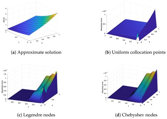 The approximate solution and absolute error with different choices of collocation points are demonstrated in Figure 3 and Figure 4 for and , respectively. We can see that when the derivative order is aninteger, the use of Chebyshev nodes provides better results, and when the order of the derivative is a non-integer, uniform nodes have better results.