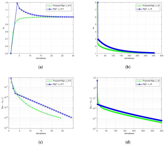 - In the algorithms proposed in [49,50], they are needed to compute two projections on the closed convex set at each iteration step, which may affect the efficiency of the algorithm. To avoid this shortcoming, we use an easy calculated projection to replace the second projection in the algorithms in [49,50].