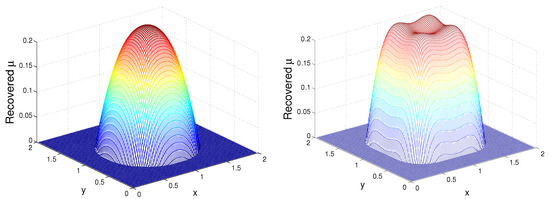 In Figure 1, we depict the recovered mortality rate in the first day after 6 h and on the second day after 8 h. Although the recovered rate is not a constant, we observe that the values of are close to the exact one, namely .