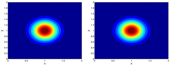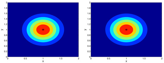 - (IMBCS-2D) The iteration method obtained by averaging the solution of the first- and the second-kind Saulyev’s scheme (25). Taking to be known from previous iteration, the first approximation is explicit if the computations are performed passing the nodes from the bottom boundary to the top and from the left boundary to the right. Similarly, the second-kind approximation is performed in an explicit manner if we compute the solution from the upper to the bottom boundary and from the right to the left boundary. Thus, we obtain the following iteration process based on the explicit schemes: