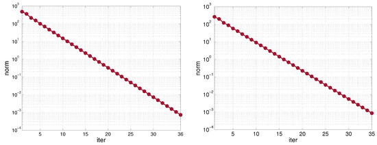 Values of the norm (29) at each iteration at Day 1 after 6 h (left), Day 2 after 6 h (right), Example 4.