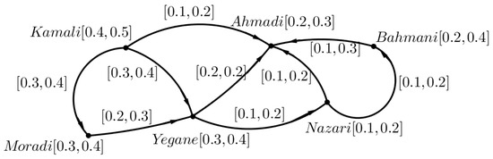 According to the above values, we consider an IVFG. The vertices show each of the department staff members. The edges indicate the level of friendship and fondness between staff. For the weight of the vertices, the lower bound and the upper bound mean the level of staff capability. The lower bound and the upper bound for the weight of the edges mean the amount of friendship and conflict, respectively. The name of the staff and level of staff capability are indicated in Table 1 and Table 2. The adjacency matrix corresponding to Figure 7 is indicated in Table 3.
