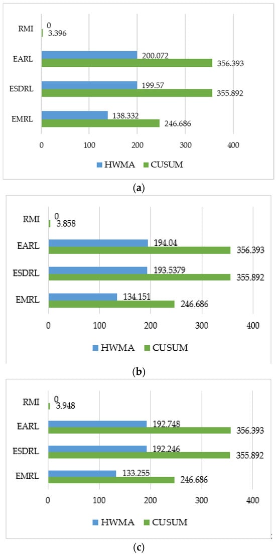 The RMI, EARL, ESDRL, and EMRL values on the control charts for MAX(3,1) when (a) = 0.1, (b) = 0.2, and (c) = 0.3.