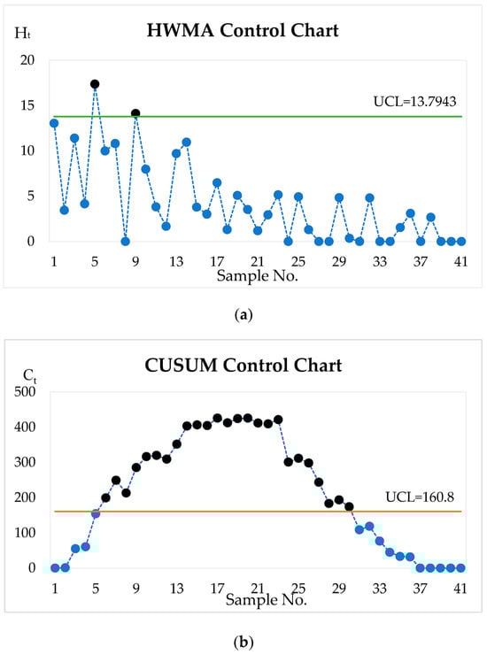The S&P 500 dataset fitted to MAX(3,1) process running on (a) HWMA control chart and (b) CUSUM control chart.