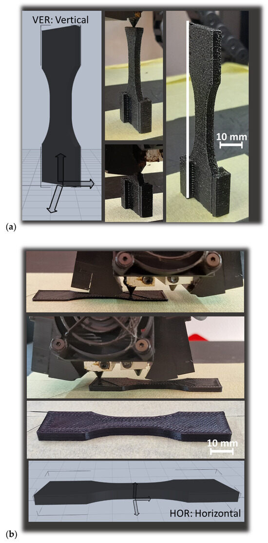 Ongoing 3D printing process of PLDA and three main orientations considered in this study: (a) vertical-VER, (b) horizontal–HOR, and (c) lateral-LAT.