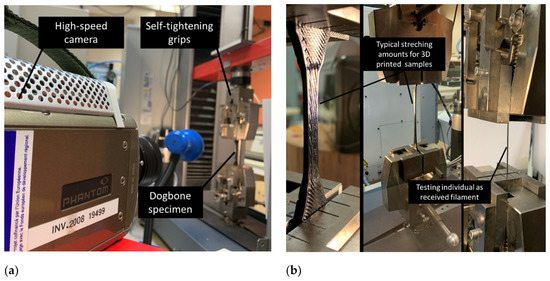 Uniaxial tensile experiments were conducted using the ProLine 10 kN universal machine from Zwick Roell Group (Ulm, Germany) under a displacement rate of 10 mm/min up to the rupture limit of the specimen (Figure 2). Both wire and printed structures were tested. Four replicates per condition were used to ensure a reliable measurement. The deformed specimens were monitored using a high-speed camera (Phantom V7.3, Photonline, Marly Le Roi, 78-France) under various frame sizes and rates.