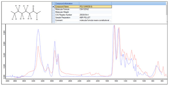 FTIR-ATR spectra of the studied filament, with typical polyamide taken as a reference: filament (red) and polyamide 6 (blue).