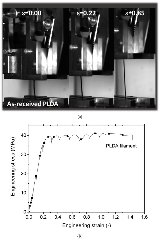 Figure 4 shows optical images extracted from the camera recording at three particular load levels for loading of the as-received PLDA wire. The sample exhibited a typical tensile response of a synthetic polymer material, with a considerable stretching capability before breaking (Figure 4a). The examination of the tensile response showed a linear stage of up to 20% of the engineering strain, followed by a quasi-perfect plasticity stage and a notable elongation at break, allowing an elongation of 1.4 times its original length. A jagged behavior was also observed, which corresponded to irregularities or fluctuations in the stress–strain curve. These can be attributed to microstructural changes occurring unevenly or intermittently during loading. Table 3 summarizes the main engineering constants. In addition to a low stiffness that can be attributed to the low load rate and high sensitivity of PLDA to strain rate, the yield stress (σY) represents roughly 85% of the tensile strength (σM). There was no significant difference between the tensile strength and the ultimate stress (σR ≈ σM). Furthermore, the elongation at break demonstrated significant variability, necessitating the use of a range of values to represent it rather than relying solely on the average and standard deviation.