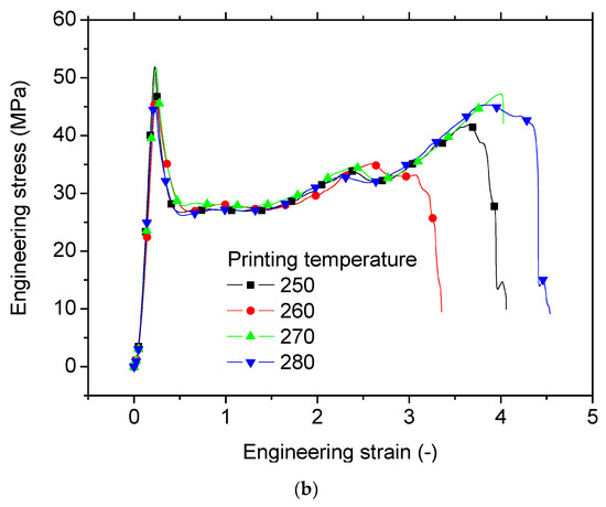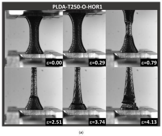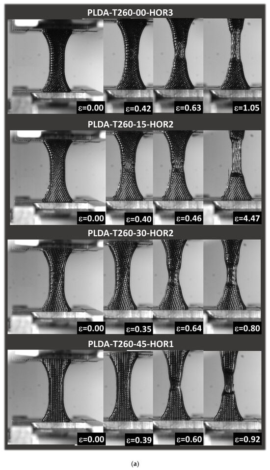 Figure 5 shows the equivalent tensile response of printed PLDA as a function of the printing temperature for a fixed orientation, corresponding to the horizontal printing configuration (i.e., building direction aligned with specimen thickness). Figure 5a shows the main stages of deformation for a typical specimen processed with a printing temperature of 250 °C and a layup of −45°/+45°. This layup allows a filament structuring in which both symmetrical in-plane and out-of-plane architectures are achieved. Indeed, material structuring is composed of a two-filament external frame, which wraps filament crossing at the exact angle of 45°. The external frame possesses a symmetrical structure in the longitudinal direction. Throughout the thickness of the specimen, two layers alternate with 45° and −45° angles, allowing for a symmetrical configuration with respect to the central plane of the specimen. From each side of this plane, 13 symmetrical layers were printed. Homogeneous extension of the specimen was observed up to the first 30% of the increase in length, with a symmetrical behavior along the initial percentage of the material extension. A second stage corresponding to the necking formation at the center of the specimen followed, as shown at the engineering strain (ε) level of 0.79 (Figure 5a). This stage corresponds to a first break in symmetry, as filaments in the central part were more subject to load transfer. Indeed, localization phenomena occurred when significant stretching of the filaments occurred. This localization corresponded to a reduction in the section of the filaments and thus to an asymmetrical behavior of the specimen. Due to the dog-bone geometry of the specimens, such localization was expected to be in the central part of the specimen. The necking achieved at large specimen extension locally modified the cross-section and propagated in the longitudinal direction to the grips. The expansion of such region towards the grip occurred (ε = 2.51) up to a point where failure was reached (ε = 4.13). This scenario was more or less the same for the other printing conditions, which was further examined through the tensile response in Figure 5b.